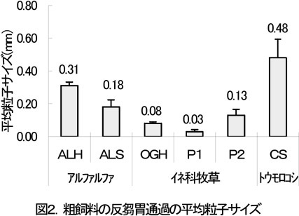 - 糞の粒度分布から反芻胃通過の平均粒子サイズを算出すると、ALHでは0.3mm、ALSでは0.18mm、CSでは0.48mmとなり、OGHの0.08mmやイネ科混播生草(1番生草;P1=0.03mm、2番生草;P2=0.13mm)に比べ大きい(図2)。