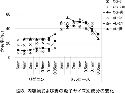 - アルファルファは、反芻胃滞留初期に細胞内容物(OCC)が急激に減少しリグニン含有率が上昇するのに対し、オーチャードグラスではOCCとともにヘミセルロースが緩やかに消化され、リグニン含有率が増加する(表1)。両草種とも粒子サイズが0.5mm以下になるとセルロースの消化が急速に進む(図3)。