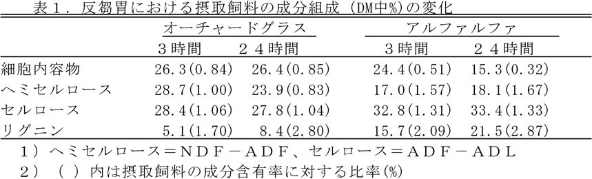 - アルファルファとトウモロコシサイレージはイネ科牧草に比べ、大きな粒子で反芻胃を通過する。消化パターンはアルファルファが反芻胃内で細胞内容物が速やかに消化されるのに対し、イネ科牧草では細胞内容物とヘミセルロースが緩やかに消化される。