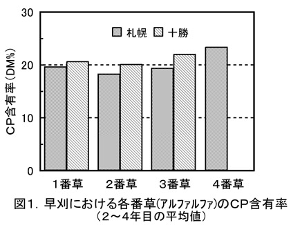 - 造成後2年目以降、概ね草丈80〜90cm、着蕾期を目途とする早刈(越冬性を加味して札幌では10月中旬までに4回刈、十勝では9月上旬までに3回刈)を行うことにより、各番草とも粗蛋白質含量が約20%のアルファルファを収穫できる(図1)。