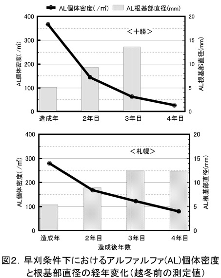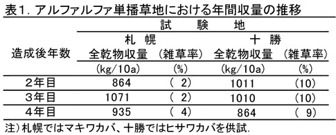 - 以上から、春に造成し造成年秋の個体密度が1平方メートル当たり約300〜350個体のアルファルファ単播草地の早刈り条件下における維持年限は4年程度と判断される。