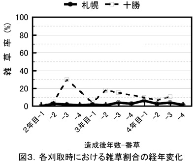 - 各刈取時の雑草割合は番草により変動するが、造成後4年目まで概ね20%以下に維持できる(図3)。