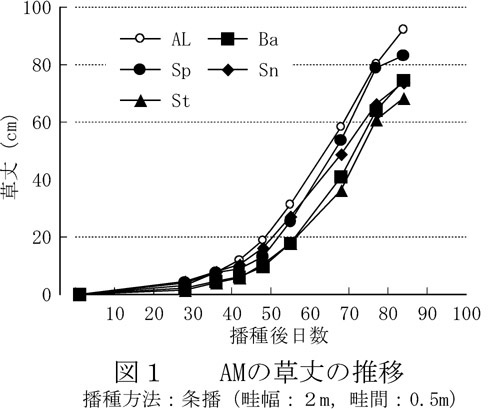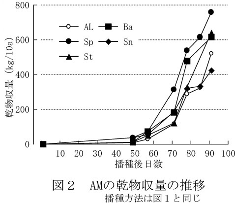- スネイルメディック(以下Sn)は、4草種中最も種子が大きく、千粒重はALの約8倍である(表1)。Snの草丈(伸ばした状態で測定)は、播種後80日目で70cmに達するが(図1)、匍匐するため草高(そのままの状態で測定)は30cm前後で推移する。Snの乾物収量は、常にALより低く推移し、ALより高い乾物収量を得るのは難しいと判断される(図2)。