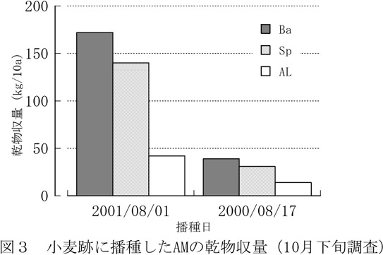 - バーレルメディック(以下Ba)の草丈は、Snと同様の推移を示す。また、Baも他草種と同様に匍匐する。Baの乾物収量は、Spより低い値で推移するが、ALより高い収量が得られる可能性が高い。夏播きの場合、8月初旬に播種することにより150kgDM/10a程度の乾物収量が期待できる(図3)。
