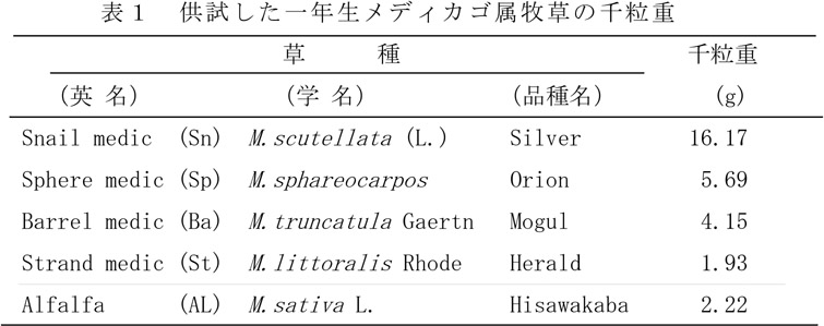 - ストランドメディック(以下St)は、4草種中最も種子が小さく、千粒重はALより小さい。Stの乾物収量は、ALより若干高い値で推移する。Stは、土壌被覆能力は高いが、草高が25cm程度と他の草種より低く、収穫には不適と判断される。