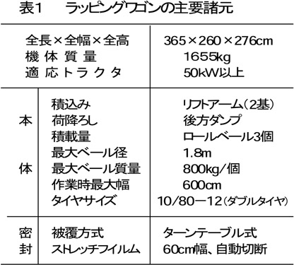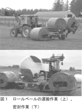- 運搬・密封機は、ターンテーブル式のベールラッパに左右一対のリフトアームを有し、ロールベールをすくい上げて、ターンテーブル上を加え合計3個のベールを一度に運搬できる(表1)。運搬後は、順次ターンテーブル上で被覆してから後方にダンプして荷降ろしする(図1)。