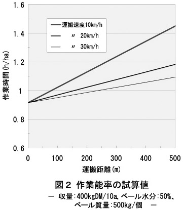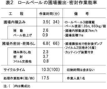 - 圃場に隣接した貯蔵場所までの、収穫から荷降ろしまでのサイクルタイムは約10分、1時間に17〜18個の密封が可能であり(表2)、圃場までの距離が300mであれば、オペレータ1名でha当たり1時間前後の作業能率で処理できる(図2)。また、圃場が遠い場合は、収穫作業と運搬・収納作業の分離が容易となる。