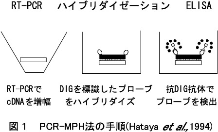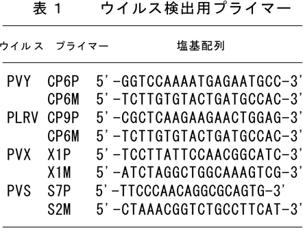 - わが国のばれいしょで重要なジャガイモYウイルス(PVY)、ジャガイモ葉巻ウイルス(PLRV)、ジャガイモXウイルス(PVX)、ジャガイモSウイルス(PVS)を特異的に検出できるプライマーを設計あるいは選定し(表1)、RT-PCR法およびPCR-MPH法(図1)によるウイルス検出法を開発した。