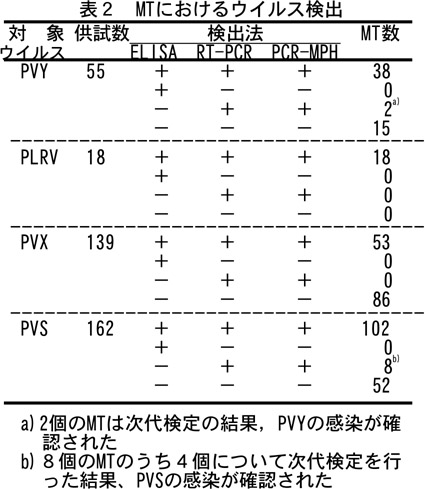 - 本遺伝子診断法により、現行法(ELISA法)で検出できなかった微量のPVYとPVSをMTから検出することができた(表2)。また、培養苗条、休眠塊茎(1次感染塊茎)からも、全てのウイルスの検出ができた。