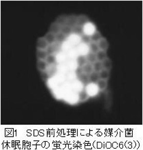 - DiOC6(3)は休眠胞子の細胞質を明瞭に染色し、FITC標識レクチンは休眠胞子の表面を主に染色するため、用途により染色法を使い分ける。