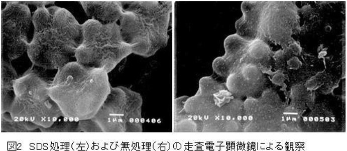 - 上記のSDS処理を行っても、休眠胞子の損傷や表面構造の変化は観察されない(図2)。