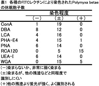 - 土壌中のテンサイそう根病の媒介菌(Polymyxa betae)休眠胞子は、SDSによる前処理により各種蛍光色素ならびにFITC標識レクチンによって染色され、蛍光顕微鏡観察が可能となる。