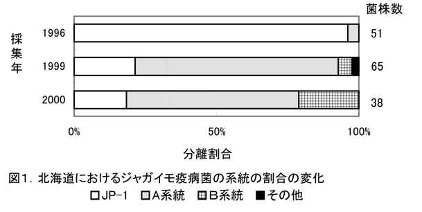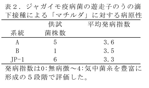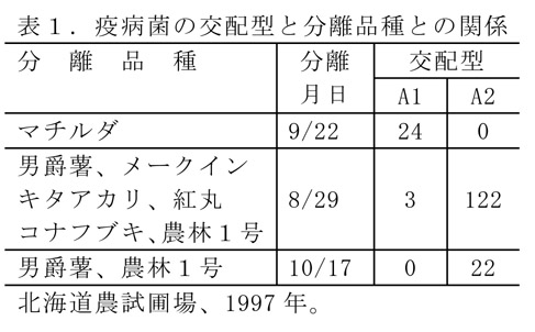 - 1997年に北海道農試圃場で「マチルダ」から分離された疫病菌菌株はA系統と同じ交配型A1のみであったが、それ以外の品種から分離された菌株はJP-1系統の特徴であるA2型であった(表1)。