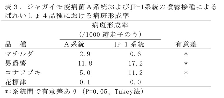 - 遊走子のうを葉に噴霧接種すると、「マチルダ」ではJP-1系統はほとんど病斑を形成しないが、A系統は高率に病斑を形成する(表3)。一方、「男爵薯」、「コナフブキ」では、A、JP-1系統とも高率に病斑を形成する。どちらの系統も病斑形成率は「男爵薯」や「コナフブキ」より「マチルダ」で低い。