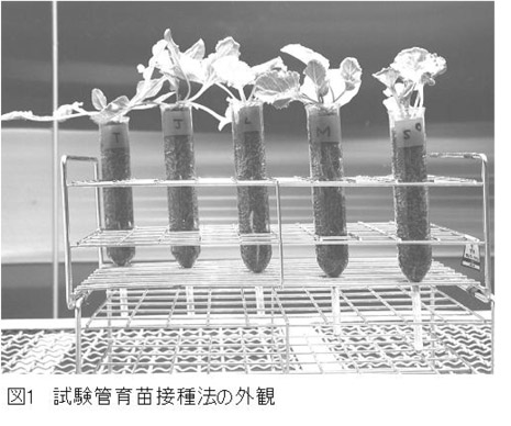 - 種子を園芸用粒状培土をつめた試験管(径24mm、長さ130mm、底部に径5mmで長さ4mmの排水管付)に播種し、人工気象室内(25℃、16時間日長)で育生する(図1)。育生期間中は、播種3週間後から週に2回1,000倍に希釈したハイポネックス液5-10-5(ハイポネックスジャパン)を液肥として与える。接種源としては、従来の麦粒培地より取り扱いやすいフスマ培地を地際部に2g施用する。