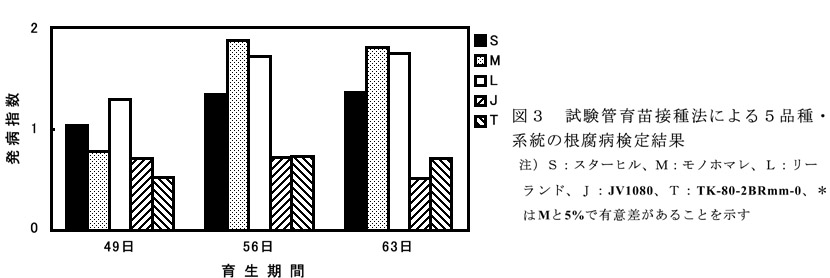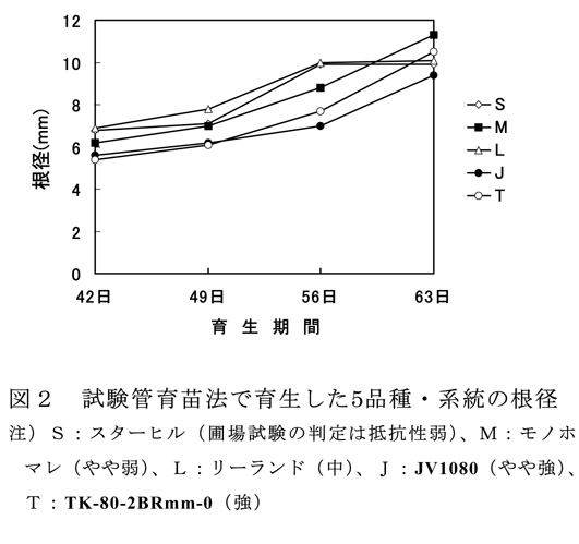 - 本接種法では、育生期間56日以降の植物体の地下部での被害調査により、抵抗性「強」と「弱」の品種・系統の検定が可能である(図3)。