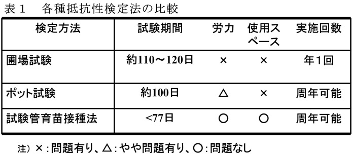 - 従来の圃場試験やポット試験法と比較すると、本法がもっとも試験に要する時間が短く、省力で、28×38cm2のスペースに最大50個体を供試でき、さらに周年実施可能であることから、検定法として優れている(表1)。