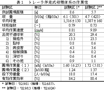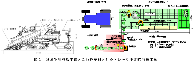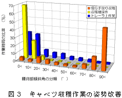 3人組作業による本体系では作業速度は約10cm/sで圃場作業量は約6h/10a、投下労働量は18人・h/10aである。手取り収穫体系(32人・h/10a)と比較して40%以上の労働時間を短縮し、有効作業効率は80〜85%である(表1)。作業者の姿勢は大きく改善され(図3)、作業強度と作業能率に基づく試算結果から1日(8時間労働)約11aの高能率収穫ができる。 |
