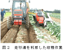 収穫前に培土機を用いて溝を形成してこれをトラクタの走行路とすることにより、安定した直進性を確保し、収穫作業の安定性にも貢献する(図2)。 |