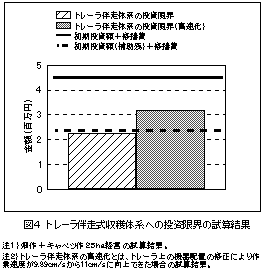 経営試算によれば、25ha規模の畑作+キャベツ作経営などでは補助事業での導入を前提とすると、初期投資額および修繕費をほぼ回収でき(図4)、併せて軽労化効果が高いことからその導入の合理性がある。 |