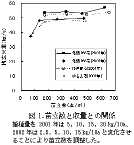 m2当たり200本以上の苗立数を確保すると収量は安定し、「ゆきまる」より多収となる(図1)。 |