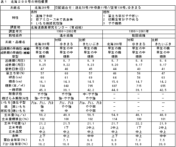 交配組合せは、道北53号/水稲中間母本農11号//空育139号(後のゆきまる)である。道北53号に由来する「あやひめ」「はなぶさ」と同じ低アミロース遺伝子をもつと推定される。 |