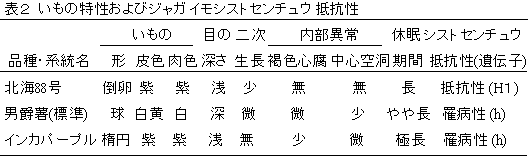 ジャガイモシストセンチュウに対し抵抗性を持ち、汚染地での栽培では同線虫の密度を低減し、未発生地では汚染の拡大を未然に防ぐ効果がある(表3)。 |