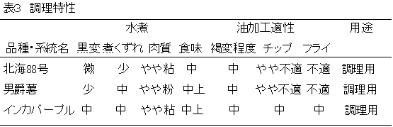 用途は調理用で、でん粉価は「男爵薯」より高く「インカパープル」より低い(表1)。目が浅いため皮は剥きやすく、内部異常はほとんどない(表2)。水煮での黒変や煮くずれは少なく、食味は中である。油加工適性はやや不適〜不適である(表3)。 |