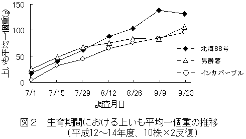 熟性は中晩生で、「インカパープル」に比べて茎長が短く、いもの1個重が大きく、収量が多く、いもの肥大が早い(表1、図2)。これらのことから、「インカパープル」より栽培しやすい。 |