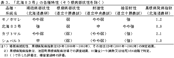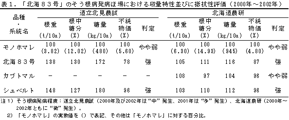 そう根病発病ほ場における糖量は「シュベルト」並であり、そう根病抵抗性は“強”である(表1)。また、褐斑病抵抗性が“強”であり、黒根病の発病指数も低く、複合抵抗性を有する(表3)。 |