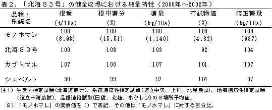 健全ほ場における根重および糖量は「カブトマル」よりやや少ないが、「シュベルト」と比べて根重、根中糖分および糖量が高い(表2)。 |