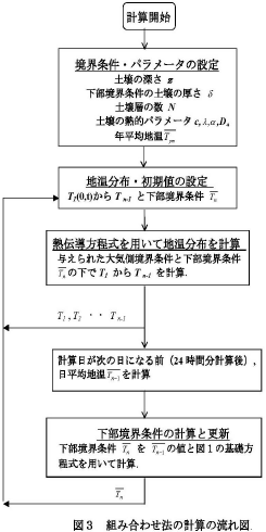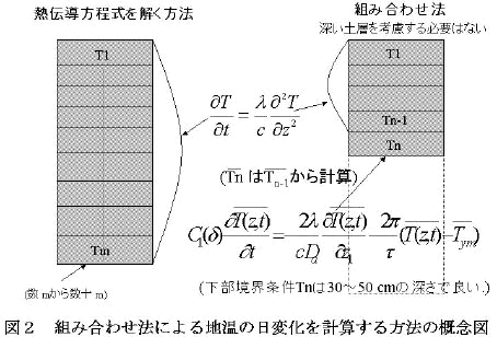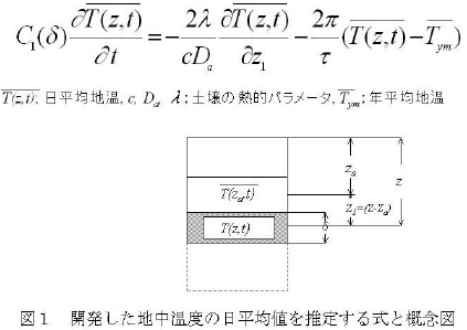 | 任意の深さの日平均地温が対象の深さより上層の地温と土壌の熱的条件からForce-Restore法を拡張した式で計算できる。さらに、この式に熱伝導方程式を結合させることで、地温の日変化も高い時間分解能で計算できる。この計算方法は、初期・境界条件や土壌の熱的条件の設定が容易である。 | |