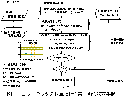牧草収穫の場合、日別作業計画は作業時間を規定するモアコンディショナの作業時間を基に策定しており、その作業能率は作業面積の広さとの関数から推計している。 |