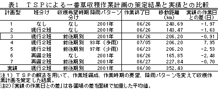 十勝管内のコントラクタの事例では、移動距離を短縮(146km)させつつ、作業を前進(平均0.9日)させる計画(計画型3)が策定され、コントラクタ収穫作業の効率化の可能性が示唆された(図2、表1)。 |