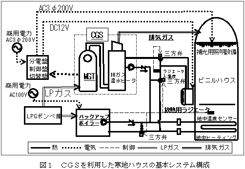 CGSを利用した寒地ハウスの環境制御のための基本システムは、熱と電気を供給するCGS(発電出力28kW、熱出力48,000kcal/h)、補光用ランプ(400Wメタルハロイドランプ)、地中加温用配管(地表下35cmにφ13mmポリエチレン管を埋設)、放熱用ラジエータ、バックアップ用ボイラーである(図1)。 |