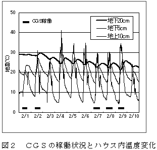 設置したハウス(縦20m×横 7m×高さ3.5mのビニールハウス2棟)における環境制御として、地表下15cmの地温で制御する。地中への加温はCGSの稼働する日中のみとして地温の変化を見ると、2〜3日の加温でその後3〜4日間無加温で設定温度を維持できる(図2)。 |