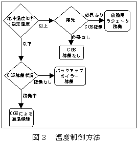地中温度が設定温度以上で排熱を地中に循環させない時でも、補光のためCGSを稼動させる場合が多く、この時にMGTを保護するためMGTの排熱を放出するラジエータが必要である。バックアップ用ボイラーは、CGSの保守点検、故障時、また補光を行わない時の施設内の熱環境を維持するために必要である。放熱用ラジエータとバックアップ用ボイラーを組み込んだ温度制御方法を図3に示す。 |