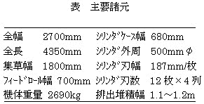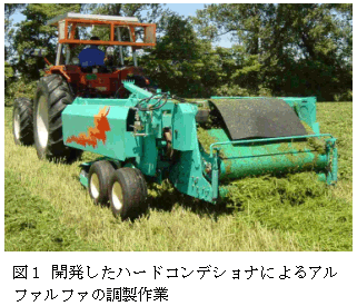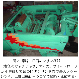 開発した牧草調製機械は、裏返しに取付けたシリンダ刃とケーシングとの5mm前後の間隙にアルファルファや混播牧草を供給して摩砕・圧縮し(図1、2)、後部の翼で広げ、さらに上下のベルトの間で圧縮、成形して排出する機構で、つまりが少なく、高速作業が可能である。