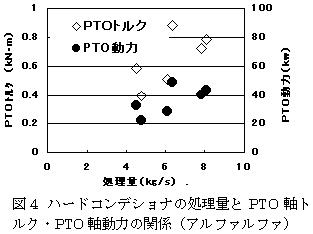 作業時の処理草量に対するPTO軸トルク、PTO軸動力は0.4〜0.9kN・m、所要動力は22〜50kWである。作業速度は6〜8km/hが可能で、作業能率は0.8ha/h〜1.4ha/h、処理能力は生草8kg/sが限界である(図4)。 |