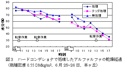 処理したアルファルファの晴天時の圃場での日中の乾燥速度は、1番草でほぼ2.0〜2.5(%wb/h)で、モアコンディショナ処理のみの2〜3倍の値を示す。1日で60%以下の低水分サイレージに調製可能である(図3)。アルファルファの脱葉損失は3%以下である。 |