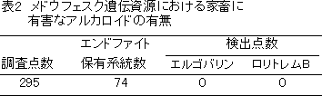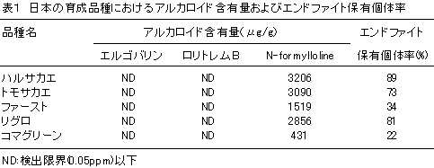 日本で育成されたメドウフェスク5品種はいずれもエンドファイトを保有している。これらは、家畜に有害なアルカロイドであるエルゴバリンとロリトレムBを含まず、家畜に無害で耐虫性に関係するロリンアルカロイドの一種N-formyllolineを含んでいる(表1)。 |