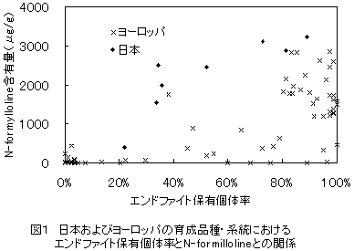 エンドファイト保有率が高いとN-formyllolineの含有量が高まる傾向にあるが、保有率が高くてもN-formyllolineの含有量の低い系統もあり、エンドファイト利用にあたっては菌株を選定する必要がある。また、日本の育成品種・系統はヨーロッパに比べてN-formyllolineの含有量が高い(図1)。 |