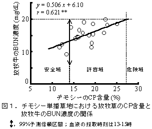 放牧草のCP含量が25%を上回ると、濃厚飼料無給与かつ全日放牧条件における放牧牛の血液中尿素態窒素(BUN)濃度は繁殖性等に望ましくない20mg/dLに至る。一方、放牧草のCP含量が15%を下回ると、放牧牛のBUN濃度が20mg/dLに至る危険性はほとんどなくなる(図1)。 |