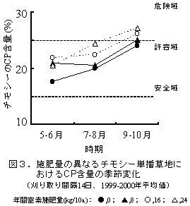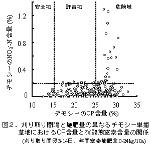 CP含量25%以上のチモシーでは、硝酸態窒素含量も危険値とされる0.2%を大幅に越えやすくなる。一方、CP含量15%未満では、硝酸態窒素含量が0.2%に至る危険性はほとんどない。この中間の水準では、硝酸態窒素含量が一時的に0.2%に至る場合があるが、大幅に越える危険性は少ない(図2)。 |