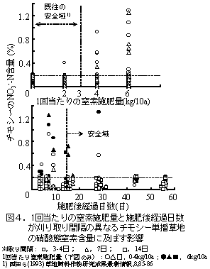 チモシー単播草地において放牧時の輪換間隔を想定した刈取り間隔を7日以上(図4△、□)とするならば、1回当たりの窒素施肥量を3kg/10a以内とし、施肥後2週間程度以降に利用することで硝酸態窒素含量上昇の危険性は小さい(図4)。 |