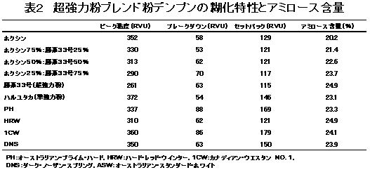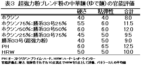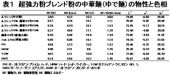 | 適当量の超強力粉(勝系33号)を中力粉(ホクシン)にブレンドすることによって、色相がやや劣る以外中華麺用粉の麺に近い品質の麺が得られる。 | |