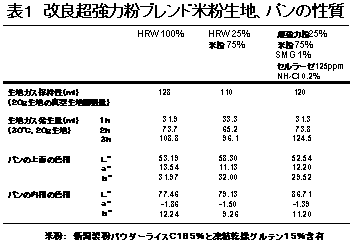 改良製法の米粉パン生地は、HRW生地より劣るがそのガス保持性がかなり向上し、生地のガス発生量はHRW生地以上である。また、改良製法の米粉パンの外観上面、内相の色相は、内相の明度(L*)が高い以外、対照のHRWのパンとほぼ同等である(表1)。 |