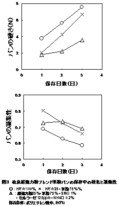 改良製法の米粉パンは、対照のHRWのパン、HRW添加米粉パンに比べ保存中の硬化が非常に遅く、対照のHRWのパンに比べ凝集性値も高くモチモチした弾力のある食感のパンである(図3)。