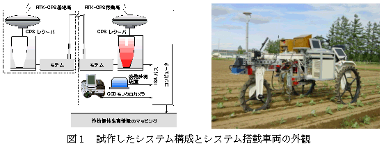 簡易に土壌と作物を分離するための赤外領域専用(650nm〜)のフィルタを装備したモノクロカメラ、画像処理ボード、RTK-GPS、光ファイバ姿勢計測装置、及びこれらのデータを処理するパソコンを管理作業車に搭載したシステム(図1)で、生育初期段階のキャベツ個体情報を収集し、マップを作成する。 |