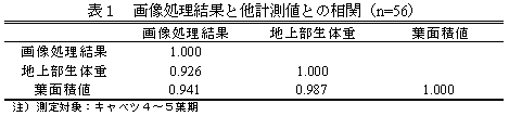 収穫時のキャベツ球重と相関(r>0.7、図表略)がある第4〜5葉期までの生育ステージにおいて、画像処理結果は生重等計測値と強い相関(r>0.9)があり(表1)、これを作物生育量として利用可能である。 |